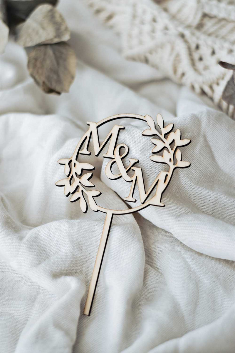 Esküvői tortadísz kezdőbetűkkel koszorúban